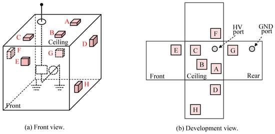 Figure 12 presents the measurement results. The figure presents an unfolded view with the ceiling surface of the metal enclosure at the center. Figure 12a depicts the sensor installation locations, and Figure 12b presents the detection results.