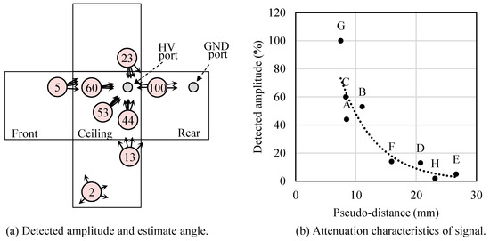 The attenuation characteristics, considering both distance and diffraction loss, are shown in Figure 12b. Here, the horizontal axis represents the pseudo-distance, which is the harmonic mean of the distances between the sensor and the HV and GND ports. Additionally, if the path between the sensor and the ports passes through a corner of the enclosure, the diffraction loss is converted into distance attenuation and incorporated. As indicated in the figure, the signal’s attenuation characteristics due to distance and diffraction loss can be formalized.