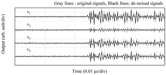 Noise reduction was performed by applying soft thresholding with a universal threshold derived from the wavelet coefficients, X(a,b), obtained via the wavelet transform. Subsequently, the inverse wavelet transform was used to convert the result into the time waveform. Figure 13 presents a comparison of the time waveforms before and after the noise reduction, which confirms the successful removal of the noise. The arrival direction was then estimated using the time waveform after the noise reduction by calculating the signal arrival time using the method described in Section 4.1, which involved determining the peak values of the waveform, and applying the calculation method described in Section 3.4.