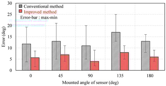 The effectiveness of the noise reduction using the wavelet transform was evaluated based on the estimation error when 100 discharges were detected at sensor installation angles of 0°, 45°, 90°, 135°, and 180°. The discharge source was a planar–vertical model, and discharges of different strengths were generated corresponding to the phase characteristics of the discharge, as shown in Figure 14. Figure 15 depicts the relationship between the estimation error and the signal strength at a sensor installation angle of 0°. Here, the signal strength represents the maximum value of V1–V4 before the noise reduction. The figure shows that the smaller the discharge strength, the larger the relative influence of noise on the measurement, and the larger the direction estimation error. Additionally, the use of wavelet transform-based denoising reduces the error. Figure 16 depicts the improvement effect at sensor installation angles of 0°, 45°, 90°, 135°, and 180°. For 100 discharges of varying strengths between 10 pC and 1000 pC, we estimated their directions using both conventional and improved methods, evaluated the estimation errors, and compared them with theoretical values. Here, the detection limit of this sensor was 50 pC. The plots indicate the arithmetic mean values, and the error bars represent the maximum and minimum values of 100 waveforms. The figure confirms that the estimation error was reduced when using the improved method for all sensor installation angles. Using the conventional method, the maximum error obtained was 25°, whereas in the improved method, it was 12°, which is approximately half of the former error. The average directional estimation accuracy of the surface current sensor was 7 degrees. This is presumed to be sufficiently accurate for practical diagnostics.