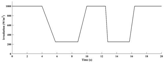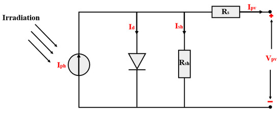 The single-diode model shown in Figure 1 includes resistive losses that are accounted for by series and shunt resistances, an anti-parallel diode that characterizes the non-linear impedance of the P-N junction, and a photogenerated current component that is affected by temperature and radiation [37]. Equations (1)–(5) encapsulate the mathematical formulation of the photovoltaic panel [38,39,40].