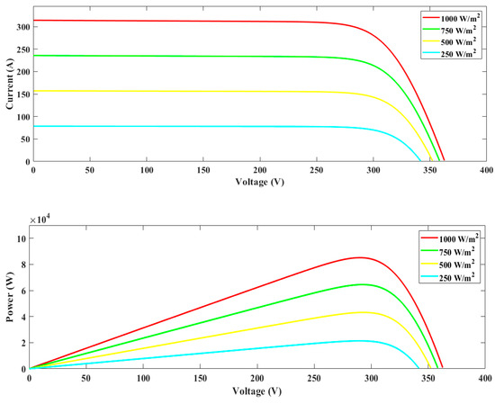 The PV system’s specifications are listed in Table 1. Figure 2 depicts the I-V and PV characteristics of the PV array under various sun irradiation intensity situations because of modeling.