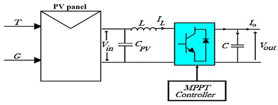 Using a boost converter in this situation aims to increase the input voltage until it reaches the desired output voltage without using a transformer [41]. As seen in Figure 4, an inductor, a capacitor, a diode, and a high-frequency switch are the essential parts of a boost converter. The equations mentioned below [42] are a result of the high-frequency switch’s operational state: