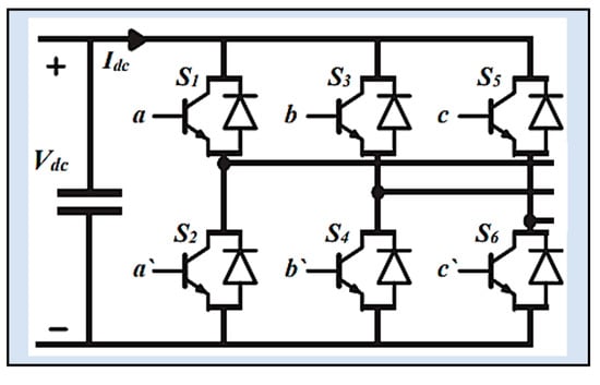 In this study, the photovoltaic system is connected to the utility infrastructure by a three-phase DC–AC voltage source inverter (VSI). The two-level, three-phase VSI that was selected for investigation is shown in Figure 6. The energy conversion process is enabled by the gate signals a, a′, b, b′, c, and c′, which are managed by the six power semiconductor switches (S1–S6) in this VSI architecture.