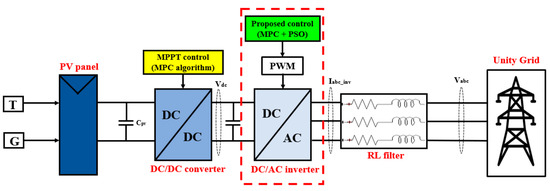 The increasing global population and ongoing industrial advancements are fueling a substantial rise in energy demand, emphasizing the critical role of energy in our daily lives [1,2,3]. Historically, fossil fuels have been a cornerstone of our energy mix. However, the combination of growing energy demands, depleting fossil fuel reserves, and mounting environmental concerns has spurred a significant shift towards cleaner energy sources, including solar, hydro, and wind energy [4]. These sources offer a compelling alternative for meeting our electricity needs while minimizing environmental impact, with solar energy emerging as a pre-eminent renewable energy source for power generation [5]. At the heart of this transition, photovoltaic (PV) systems play a pivotal role in converting solar energy into electricity [6,7]. The global PV sector has experienced substantial growth, partially attributed to the declining costs of solar modules [8]. Nevertheless, PV modules still constitute a substantial portion of the overall expenditure in a power generation system [9]. Hence, optimizing the efficiency of PV modules has become paramount in driving down electricity production costs. The construction of efficient PV systems hinges on the development of precise PV models capable of accurately predicting the output of individual PV modules, a prerequisite for tasks like optimizing PV module placement [10]. Irrespective of environmental conditions, PV solar systems employ maximum power point tracking (MPPT) methods to maximize electricity extraction. An array of MPPT algorithms, ranging from basic to sophisticated, has been devised to calculate the maximum power point (MPP) based on the application and weather conditions [11]. The primary objective of MPPT is to enhance the output power of PV modules under varying radiation and temperature conditions. Consequently, a myriad of MPPT algorithms has emerged, exhibiting varying tracking speeds, costs, and technological requirements for application and implementation [12,13,14,15]. Notably, Model Predictive Control (MPC) has surfaced as a prospective MPPT technique in PV systems, leveraging mathematical models to predict system behavior and adapt control actions accordingly [16]. The core contribution of this study lies in the prediction of a single-step temporal horizon error using the MPC framework to amplify energy harvesting efficiency within the well-established incremental conductance (IN-C) MPPT method. While IN-C excels in energy harvesting, its control eventually converges to a limit cycle centered around the MPP, constraining its ability to quantify transient solar irradiance due to its relatively slow operation [17]. The proposed method strives to enhance the energy capture capability of PV panels. The PV system integrates with the power grid via a DC–DC chopper and a DC–AC inverter, with numerous strategies proposed for optimizing this integration. One such approach involves controlling the DC–DC chopper through an MPPT technique, ensuring optimal energy extraction even under fluctuating environmental conditions [18,19,20,21]. Significantly, considerable attention has been devoted to control schemes for DC–AC inverters to bolster the operational performance of grid-connected PV systems during unforeseen circumstances. These control systems facilitate active and reactive load flow management between the grid and the PV system, playing a pivotal role in enhancing system stability and improving voltage profiles at the Point of Common Coupling [22,23,24,25]. Previous studies have advocated for the use of PI controllers to enhance transient stability in grid-connected PV systems [26]. However, conventional PI control has proven insufficient in achieving significant system stability enhancements. To address this limitation, this study introduces a novel control scheme designed to deliver prompt responses, reliable dynamic performance, and mitigation of adverse effects on the inverter or degradation in power quality [27,28]. One notable advantage of utilizing MPC is its capacity to streamline the development of various controllers while accommodating system constraints within its formulation. Moreover, this work recommends the incorporation of Particle Swarm Optimization (PSO) as a user-friendly optimization technique to augment the cost function of the MPC controller. The subsequent sections of this document are structured as follows: Section 2 provides an overview of the PV system’s components and their respective roles, along with the proposed control mechanism based on PSO optimization and predictive control. In Section 3, we elaborate on the simulation methodology and present the obtained results. Finally, Section 4 concludes the manuscript, underscores its contributions, and suggests avenues for future research.