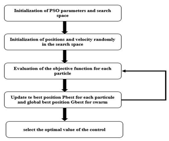 Kennedy and Eberhart [50] proposed the PSO algorithm, an evolutionary method that makes use of swarm intelligence. It shows that, even with fewer iterations, it is possible to efficiently optimize extreme points and find global minima inside the search space. The PSO algorithm is resilient to the particle’s initial position and can locate both local and global optima within a given range. Due to its adaptability, it can be used to solve a variety of optimization issues, including MPC. The main goal of MPC is to minimize a certain objective function over a finite time horizon while taking system dynamics and limitations into account. Different control goals, such as limiting tracking error, cutting energy use, or cost optimization, can be represented by the objective function. By simulating a set of particles, PSO in the context of MPC optimizes control inputs across the prediction horizon. Within the search space, each particle represents a voltage reference solution [51]. The particles consider their own best location, known as the local best, and travel in the direction of the global best voltage reference that the swarm has discovered. Particle locations and velocities, which are adjusted throughout each algorithm iteration depending on the assessment of their fitness function, control how they travel (Figure 8).