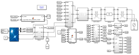 This segment represents the fundamental elements of the PV system. It all starts with the PV panel, which is responsible for converting solar radiation into electrical energy. Additionally, the system employs a boost converter and MPPT control with the MPC method. The main purpose of the boost converter is to raise the output voltage of the PV array, which improves the efficiency of the power conversion process. The MPPT control algorithm continually tracks and monitors the maximum power point of the PV system. By constantly adjusting the boost converter’s operational parameters, it ensures that the PV panel harvests the optimal amount of power under varying climatic circumstances. The system also includes a DC–AC converter, which converts the DC power generated by the PV system into AC power suitable for grid integration. This converter must maintain a power factor of one, guarantee effective power transmission, and adhere to grid connection rules to enable the smooth integration of renewable energy into the existing power system.