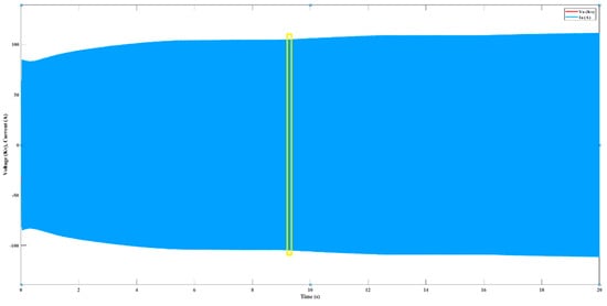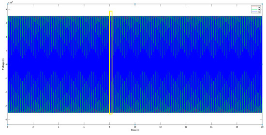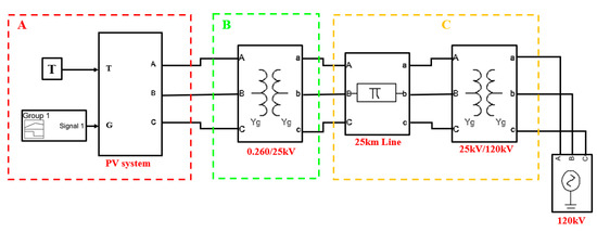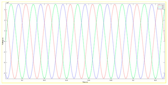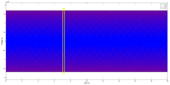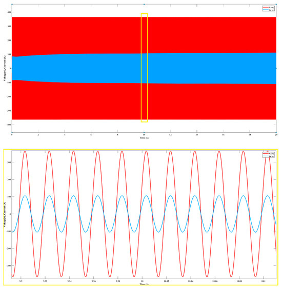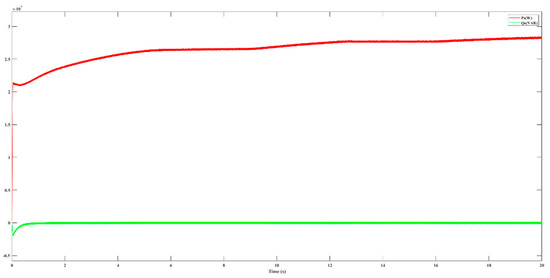 The transformer’s main function in component B of the PV system is to boost the system’s voltage. This is necessary to ensure that the power grid’s voltage requirements are met, enabling effective power transmission. Power losses during the transmission process can be reduced by lowering the current by raising the voltage level. Additionally, increasing the voltage makes it possible to transmit electrical energy farther away with fewer losses. Figure 17, Figure 18 and Figure 19 show the outcomes of the PV system’s performance with the addition of a transformer with a 0.26/25 kV rating.