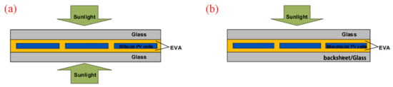 Bifacial solar modules have long been regarded as an effective way to increase power generation by utilizing diffused, scattered, and reflected light, yet mass production has been boosted since 2016. The passivated emitter and rear contact (PERC) structure allows local silicon–metal contact; so, it is more suitable for “double-sided” photon-electron conversion, rather than the standard BSF (back surface field) structure. Meanwhile, unlike the mono-facial module with a TPT (Teldar/polyethylene terephthalate/Teldar) back sheet on the rear side, the bifacial module is replaced by a glass or transparent back sheet, which increases the potential of utilizing the beam irradiation reflected from the ground and improves its general reliability, as shown in Figure 1.