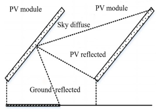The view factor from the ground to the module should be considered if the installation state of PV module arrays alters. Thus, the ground cover ratio (GCR) was proposed and defined as the coverage of the module on the ground, which could be simplified as the ratio of the module length and spacing between neighbor rows with the same tilt angle. In a regular type of solar system, the module length is consistent with the size; therefore, the GCR is only determined by the spacing. A schematic diagram of the ground reflection is shown in Figure 3.