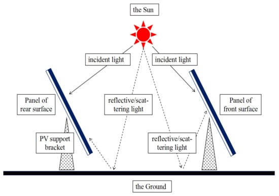 Albedo plays a vital role in the energy balance of the Earth’s surface since it defines the rate of absorbed solar radiation [2]. The albedo of the solar module installation site is always considered first, because it is a sensible estimation for small-angle tilted PV system simulations. Moreover, the albedo is the ratio of the radiation reflected from the illuminated surface to the incoming radiation, and the value extends from 0 to 1; therefore, it is influenced by the surface morphology and optical path where the modules are placed. The definition of albedo is the ratio of reflected and incident light.