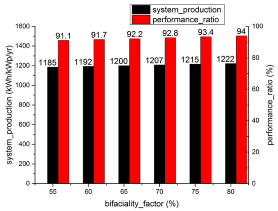 System production and performance ratio for an increasing bifacial factor ranging from 55% to 80%.