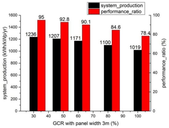The PV-SYST software simulation was conducted based on the aforementioned simulation interface settings, as described Section 2 of this paper, except for the different spacings, and is depicted the curves presented in Figure 7, illustrating the PV system production and efficiency changes with different spacings. It can be implied that the system production and efficiency seem stable while the GCR is less than 50%, because more beams are reflected from the ground with a larger view factor.