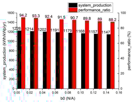 In the latest version, the IAM model is accessible to the Fresnel model, which is optional for various encapsulants. For example, when modules are coated with anti-reflective or textured glass, the surface is not as smooth as normal glass or plastic; therefore, the incident light is reflected more than once in theory, and the equivalent incident angle is reduced, thus increasing the system power production and performance ratio. We acknowledged a reduction in the energy loss value by 0.4% due to the IAM factor with the anti-reflective glass, as the energy flow shows in Table 6. Therefore, adjustable angle brackets are also recommended to take advantage of the light-trapping effect. After carefully checking the system power production report with the module b0 value based on the PV-SYST software simulation output, which contained a system pow gain flowchart, these key data were collected and presented in Table 7. Table 7 shows the different b0 values corresponding to the different IAM factor loss values.