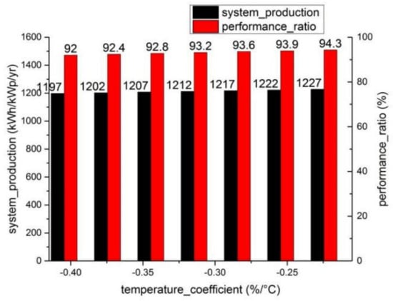 A higher system power production and performance ratio was achieved using a module with a lower temperature coefficient, which is usually described as negative. A relatively slow heating rate reduces the waste of actual electric generation. The temperature coefficient of the module in our simulation was −0.34, corresponding to a system efficiency of 92.8% (performance ratio).