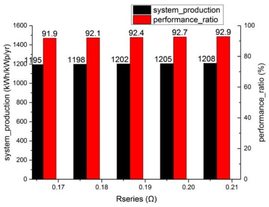 The increase in the series resistance (Rs) value of the PV system is generally divided into two cases, that is, the Rs inside solar modules and that of connection materials, such as electric wires, junction box, etc., and only the former is analyzed here. The former case is dramatically separated into two parts, namely, the increase in the Rs value of the solar cell and that of interconnecting ribbons or strings. On the one hand, as the Rs of the solar cell is independent of the short circuit (Isc), the corresponding open voltage (Voc) of the cell is nearly in direct proportion to an increasing Rs value; on the other hand, the Voc of the solar module also increases after an extra voltage subdivision due to an increase in the ribbon Rs value. According to the PV system model of the PV-SYST software, the former case was handled simply with an increasing Rs value. Thus, the tendencies of the system’s power production and performance ratio followed by an increasing Rs value are plotted in Figure 11, based on the system power production simulation report. All the simulation output data were based on the aforementioned simulation interface settings, as described Section 2 of this paper, except the different Rs value.