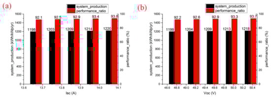 (a) System production and performance ratio for an increasing Isc value with a constant Pmpp value; (b) system production and performance ratio for an increasing Voc value with a constant Pmpp value.