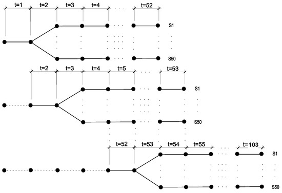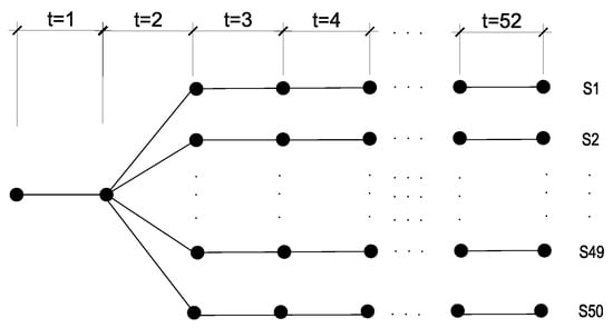 The stochastic optimization model maximizes the value of stored water and minimizes load shedding, considering the uncertainties in the inflows of the reservoirs. The optimization problem is realized as a two-stage stochastic model with a weekly time resolution and a one-year planning period. The first stage comprises the first week of the planning period, and the second stage comprises the rest of the year and all inflow scenarios, as shown in the scenario tree in Figure 1.