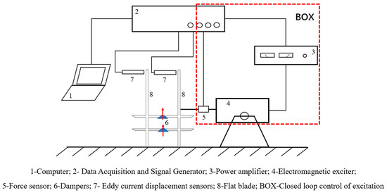 The blades can be excited using both contact and non-contact methods. When using non-contact excitation, there is no direct contact with the blade, avoiding the additional influence of the excitation system on the vibration characteristics of the blade. The magnitude of the excitation force is difficult, if not impossible, to directly measure. Therefore, an electromagnetic exciter was used for excitation in the experiment. The electromagnetic exciter is directly connected to the blade, and the magnitude of the excitation force is measured by a force sensor mounted on the top of the exciter. The signal generator sends out a sinusoidal signal, which is amplified by a power amplifier, and then drives the exciter to operate. The force sensor can measure the magnitude of the excitation force in real time and then feed the force signal back to the signal generator. Then, the signal generator adjusts the signal output to ensure that the exciter can output a constant amplitude of excitation force, as shown in the BOX in Figure 1, forming a closed loop. During the experiment, the interaction between the excitation rod and the excited blade will affect the natural characteristics of the blade through exerting additional stiffness and damping effects on the blade [22]. To mitigate this impact, the excitation rod is positioned in close proximity to the nodal line near the blade root.
