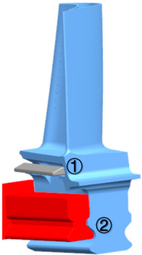 Figure 3 shows the schematic of the dual friction damper structure of a gas turbine blade. It can be seen that this blade has a friction-damping device at the platform groove (position ①). When the blade rotates, the working surface of the damper makes contact with the platform, which results in a frictional damping effect and energy dissipation. Another friction-damping device was applied to position ② at the top of the blade root. The damping structure at this position not only serves as a damping device but also enables gas sealing, utilizing the sealing structure at the rear position.