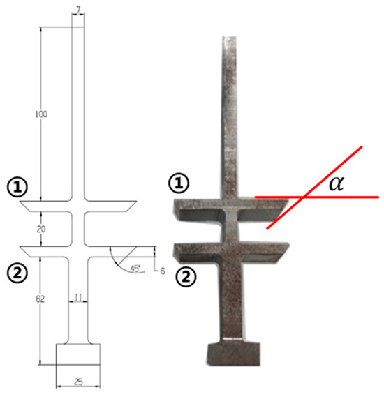 Using a real turbine blade structure model in the experimental process has some disadvantages, such as: the natural frequency of the first-order bending mode being too high, making it difficult to excite; the frictional damping effect generated when the tenon root position is installed, which is not easily eliminated; and the complex structure of the damping device, which makes it difficult to apply the centrifugal force. In order to avoid the adverse factors mentioned above, the real blade is simplified as an experiment blade, and parts that can easily highlight the structural features are processed, as shown in Figure 4. The experiment blade is made of steel. The upper damping (position ①) and the lower damping (position ②) are provided. In order to highlight the structural features and at the same time facilitate the control of experimental variables, the upper and lower platforms were designed in the same form. To avoid frictional self-locking as well as to observe the damping effect more clearly, the platform angle α was 45° in this experiment, as shown in Figure 4.
