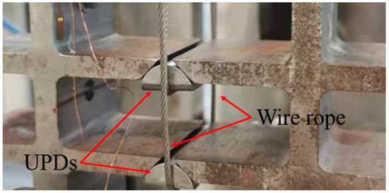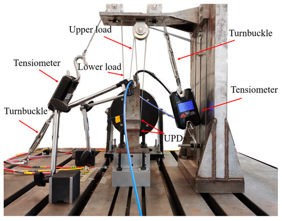 In the experimental process, the normal load is applied, as shown in Figure 5. This loading method can ensure the stability of the normal load and facilitate its continuous adjustment. One end of the wire rope is wrapped around the bottom of the UPD, and the other end is connected to the tensiometer through the pulley device (the measurement accuracy of the tensiometer is ±0.5 N), and then connected to the other end of the tensiometer and the test rig through a turnbuckle. The normal load applied to the surface of the damper is varied by adjusting the degree of tightening of the turnbuckle, the magnitude of which is measured by a tensiometer. The upper and lower dampers are used in the same way for the application of normal load, as shown in Figure 6. Each UPD is pulled against the blade platforms by two wires. Two wires were chosen instead of one to distribute the load along the damper axis more uniformly. Moreover, the two wires were long enough to ensure flexibility.