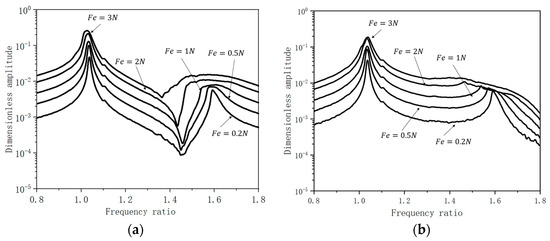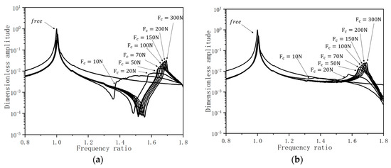 The normal load between two contact surfaces is an important parameter, as it will affect the status of contact and the energy dissipated during vibration. In the following study, an R7 damper was used to act on the upper platform ①, with an excitation force of N and a gradually increasing normal load . The FRF curves (average values) of the directly and indirectly excited blades are plotted in Figure 9, where “” represents the response curves when no damper is used. The horizontal axis represents the frequency ratio, which is the swept frequency divided by the resonant frequency of the first-order bending, and the vertical axis represents the dimensionless amplitude, which is the swept amplitude divided by the resonant amplitude of the first-order bending.