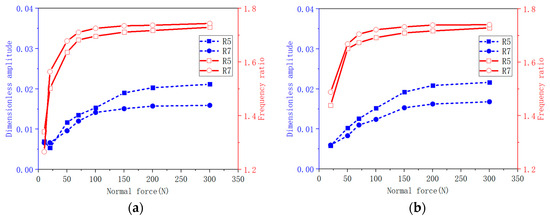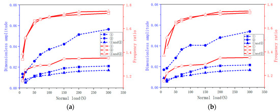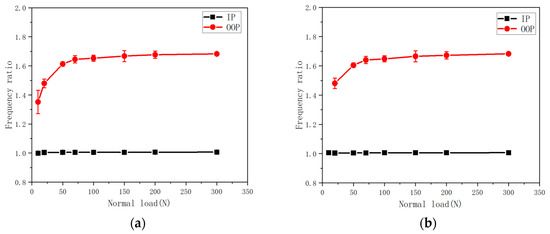 Resonance frequency ratio curves under different normal loads. (a) Directly excited blade. (b) Indirectly excited blade.