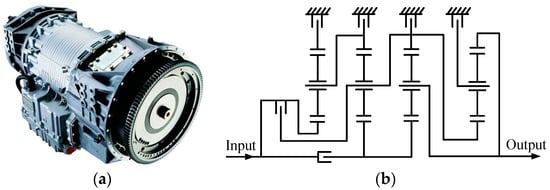As the core device of engine-driven vehicle powertrains, the automatic transmission (AT) can obtain different output torques and speeds. In the 1940s, General Motors in the United States developed the world’s first truly mass-produced AT. Since then, ATs have been widely installed in various civilian and military vehicles. Due to their advantages such as good fuel economy, high transmission efficiency, high torque capacity and smooth shifting, ATs with seven or more forward gears are usually used in luxury vehicles. Japanese Aisin company produced the world’s first 8-speed AT called AA80E. German Mercedes-Benz company invented the 9G-Tronic 9-speed AT. Figure 1a shows the HD4070 7-speed AT [], which is developed by the U.S. company Allison. The speed ratios of its seven forward gears are 7.63, 3.51, 1.91, 1.43, 1, 0.74 and 0.64, respectively, and its reverse speed ratio is −4.8. This AT has been applied in heavy-duty commercial and military vehicles. The corresponding schematic diagram of the mechanism is shown in Figure 1b.