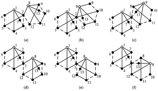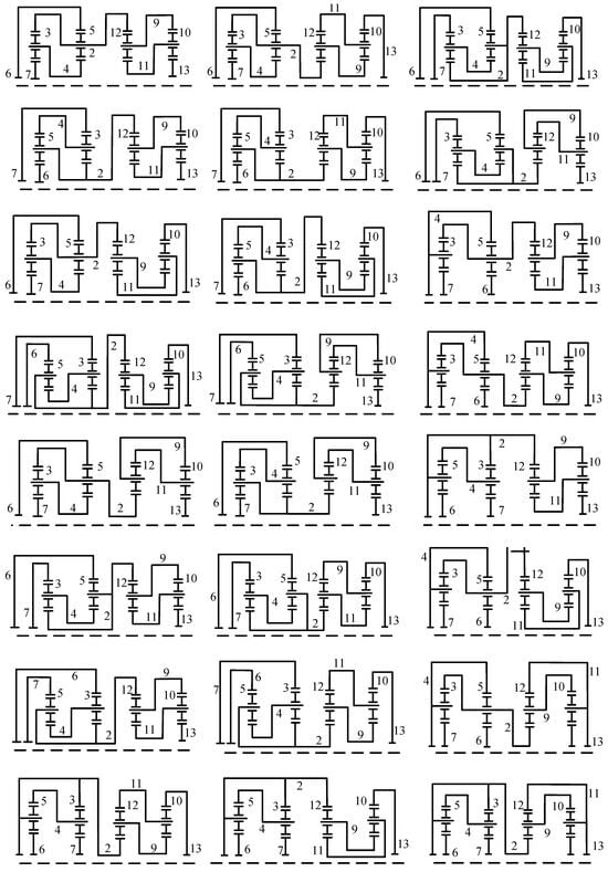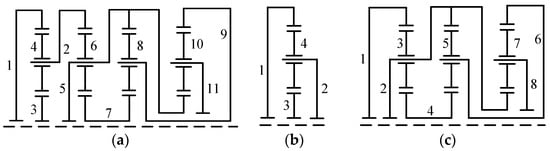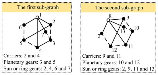 The process of sketching functional diagrams corresponding to a fractionated PGT graph is as follows. (a) A fractionated PGT graph can be separated into two independent sub-graphs. For each subgraph, carriers and planetary gears are determined based on the path of revolute edges. In a revolute edge path with the length of two, starting from the hollow vertex, the first solid vertex represents a carrier, and the second solid vertex represents a planetary gear on that carrier. A gear that meshes with the planetary gear is a ring gear or sun gear. (b) All possible functional diagrams of each subgraph of the PGT graph are sketched. (c) The link with the same label in the two separate functional diagrams is connected to obtain the functional diagrams of the fractionated PGT graph. For example, two subgraphs of the first PGT graph in Figure 6 are shown in Figure 7. In the first subgraph, the revolute edge paths with the length of two, starting from hollow vertex 1, are paths 1-2-5 and 1-4-3. For path 1-2-5, link 2 is identified as a carrier, link 5 is its corresponding planetary gear, and links 4 and 6 that mesh with link 5 are ring gears or sun gears. For path 1-4-3, link 4 is a carrier, link 3 is its corresponding planetary gear, and links 2 and 7 that mesh with link 3 are ring gears or sun gears. In the second subgraph, the revolute edge paths with the length of two, starting from hollow vertex 8, are paths 8-9-12 and 8-11-10. For path 8-9-12, link 9 is a carrier, link 12 is its corresponding planetary gear, links 2 and 11 that mesh with link 12 as ring gears or sun gears. For path 8-11-10, link 11 is a carrier, link 10 is its corresponding planetary gear, and links 9 and 13 that mesh with link 10 are ring gears or sun gears. By connecting the link with the same label (link 2) in the two separate sub-functional diagrams, all feasible functional diagrams corresponding to the first PGT graph in Figure 6 are obtained and shown in Figure 8.