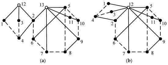 The symmetry detection results obtained by applying the above method to the topological graphs in Figure 4 are as follows. In Figure 4a, there are no symmetric vertices. In Figure 4b, vertices 3 and 5 are symmetric, and vertices 6 and 7 are symmetric, which are denoted as S1 = {3, 5} and S2 = {6, 7}. In Figure 4c, vertices 2 and 4 are symmetric, vertices 3 and 5 are symmetric, and vertices 6 and 7 are symmetric, which are denoted as S1 = {2, 4}, S2 = {3, 5} and S3 = {6, 7}.