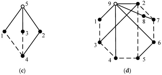 For example, vertex 1 in Figure 4c is adjacent to vertices 2, 4, 6 and 7, whose weights are 6, 6, 4 and 4, respectively. By arranging these four weights in descending order, the weight array of vertex 1 is obtained as (6, 6, 4, 4). Similarly, the weight arrays of vertices 2–7 of Figure 4c are (8, 8, 4), (6, 6, 4), (8, 8, 4), (6, 6, 4), (8, 4) and (8, 4), respectively. Vertices 2 and 4 have the same weight array, so they are placed in the same group. Similarly, vertices 3 and 5 and vertices 7 and 8 are placed in the same groups, respectively. The groups of vertices are acquired as Group1 = {1}, Group2 = {6, 7}, Group3 = {2, 4} and Group4 = {3, 5}. The vertices in different groups are clearly asymmetric. However, the vertices in the same group need to be further verified whether they are symmetric.