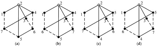 For example, let us consider whether vertices 6 and 7 in Group2 = {6, 7} are symmetric. The process of obtaining the feature code of vertex 6 in Figure 4c is as follows. Vertex 6 is placed separately in the first group, and the new vertex groups are acquired as Group1 = {6}, Group2 = {1}, Group3 = {7}, Group4 = {2, 4} and Group5 = {3, 5}. According to the permutations of vertices in each group, there are four ways to relabel the vertices in Figure 4c, namely, 1 ×1 × 1× 2 × 2 = 4. In the first way of relabeling, vertices 6, 1, 7, 2, 4, 3 and 5 in Figure 4c are, respectively, relabeled as 1 to 7, as shown in Figure 5a. In the second way of relabeling, vertices 6, 1, 7, 2, 4, 5 and 3 in Figure 4c are, respectively, relabeled as 1 to 7, as shown in Figure 5b. Similarly, the other two ways of relabeling are shown in Figure 5c,d. The adjacency matrices of the four relabeled graphs in Figure 5 are obtained as AM4, AM5, AM6 and AM7 in Equation (5), respectively. By concatenating the triangular elements of the adjacency matrix, the number strings of the four graphs in Figure 5 are obtained and shown in Table 1. Among the four number strings, NSd has the maximum value. Therefore, NSd = 100030-11100-0003-032-23-0 is determined as the feature code of vertex 6 in Figure 4c. Similarly, the process of obtaining the feature code of vertex 7 in Figure 4c is as follows. By placing vertex 7 separately in the first group, new vertex groups are obtained as Group1 = {7}, Group2 = {1}, Group3 = {6}, Group4 = {2, 4} and Group5 = {3, 5}. There are also four ways to relabel Figure 4c. The derived feature code of vertex 7 in Figure 4c is the same as that of vertex 6, i.e., Code6 = Code7 = 100030-11100-0003-032-23-0. Therefore, vertices 6 and 7 in Figure 4c are symmetric, and the reasoning process is as follows. The feature code Codei of vertex i has a strict one-to-one correspondence with that vertex. The feature code Code6 obtained by relabeling vertex 6 as 1 is equal to the feature code Code7 obtained by relabeling vertex 7 as 1. Hence, vertices 6 and 7 have exactly the same topological characteristics.