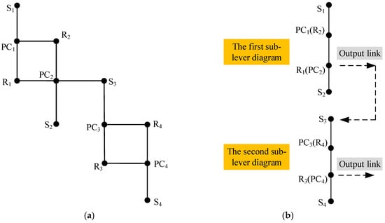 Lever diagram corresponding to the first functional diagram in Figure 8 (a), and the equivalent simplified lever diagram (b).