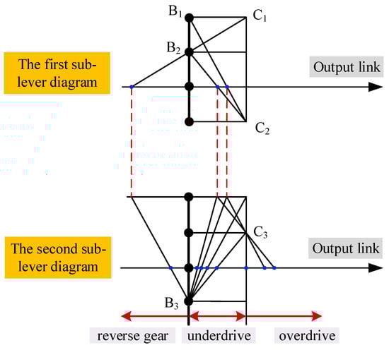 The lever diagram corresponding to a fractionated functional diagram contains two sub-lever diagrams. For example, the lever diagram corresponding to the first PGT functional diagram in Figure 8 is shown in Figure 9a, and the equivalent simplified lever diagram is shown in Figure 9b, where Sx, PCx and Rx (x =1, 2, 3, 4) represent the sun gear, planetary carrier and ring gear, respectively. Component R1 (PC2) is the output link of the first sub-lever diagram, and its output speed is passed into the second sub-lever diagram as the input speed. Component R3 (PC4) is selected as the output link of the second sub-lever diagram, namely, the output of the entire PGT lever diagram. Its speed is the output speed of the designed AT mechanism.
