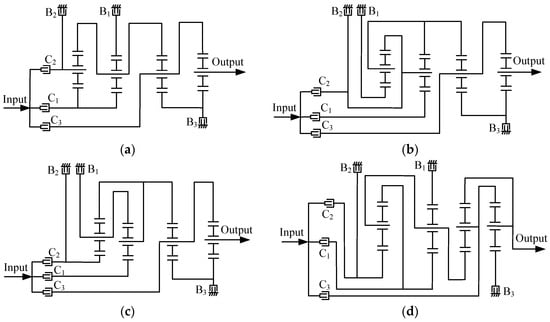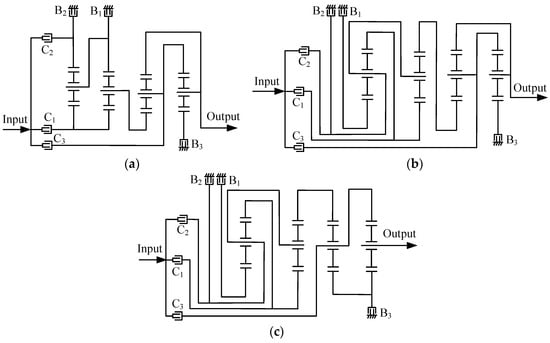 By determining reasonable arrangement schemes of control elements (clutches and brakes) in the functional diagram of PGTs, the design of AT mechanisms can be completed. For example, when using the lever diagram of PGT in Figure 9 to design a 7-speed AT mechanism, the arrangement of control elements is shown in Figure 10, where B1, B2 and B3 represent brakes, and C1, C2 and C3 represent clutches. The derived new 7-speed AT mechanism is shown in Figure 11a. This mechanism can achieve seven forward gears (two overdrive gears, one direct gear and four underdrive gears) and one reverse gear. The characteristic parameter k of a planetary gear set is the tooth ratio between the ring gear and the sun gear, and its value should be between 1.4 and 4. The step ratio of two adjacent speed ratios should be between 1.1 and 1.8, that is, 1.1 ≤ ij/ij+1 ≤ 2.1, where ij represents the speed ratio of jth forward gear. In order to ensure reasonable speed ratios and step ratios of the AT mechanism, a traversal cycle can be implemented using MATLAB programming to determine appropriate value of the characteristic parameter k of each planetary gear set. For example, the characteristic parameters of the four planetary gear sets in Figure 9a are denoted as k1, k2, k3 and k4, respectively. According to Figure 10, the relationship between each speed ratio and the characteristic parameters for the mechanism in Figure 11a is shown in Table 2. The determined values for the characteristic parameters are k1 = 2.4, k2 = 2.55, k3 = 1.5 and k4 = 2.5. By substituting the values of characteristic parameters into the speed ratio expressions in Table 2, the speed ratios of the seven forward gears and one reverse gear of the 7-speed AT mechanism in Figure 11a are determined as 7.1, 3.5, 2, 1.4, 1, 0.78, 0.68 and −4.8, respectively. The speed ratio of each gear in Figure 11a and the operating mode of control elements are shown in Table 3. The speed ratios of the underdrive gears of this AT mechanism are relatively large. Therefore, this AT mechanism can provide a larger output torque during the vehicle’s startup phase, which is suitable for heavy-duty vehicles.