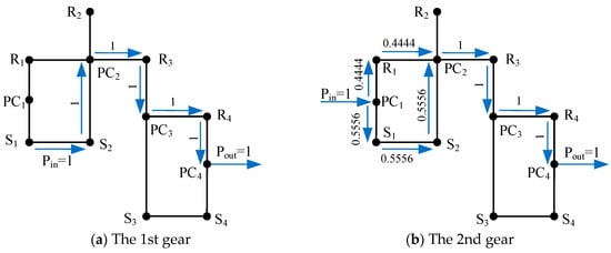 The calculated power values here represent the theoretical powers without losses. For example, the power flowing through each component for different gears of the AT mechanism in Figure 13a is shown in Table 5. When this AT mechanism works at the 3rd gear, there is power circulation in the first planetary gear set. However, the value 1.5 of power circulation is relatively small, resulting in less efficiency loss; hence, the configuration of this mechanism is still feasible. Under the working conditions of the 5th gear in direct drive, clutches C1, C2 and C3 are engaged simultaneously, driving the AT mechanism to rotate as a whole and directly transmitting power to the output shaft. Therefore, there is no power flow within the four planetary gear sets, so the fifth gear in direct drive is not included in Table 5. According to the power values in Table 5, the power flow diagram for each gear can be sketched. For instance, in the lever diagram corresponding to the AT mechanism in Figure 13a, the power flow diagrams for the 1st and 2nd gears are shown in Figure 14.