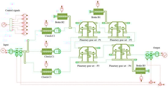 Performance analysis and simulation can be used to evaluate the performances of AT mechanisms, making it easier to select mechanism configurations with excellent performances from a large number of designed AT mechanisms. This section considers the 9-speed AT mechanism shown in Figure 13a as an example to study the kinematic analysis, torque analysis, power flow analysis, efficiency analysis and simulation of the AT mechanism.
