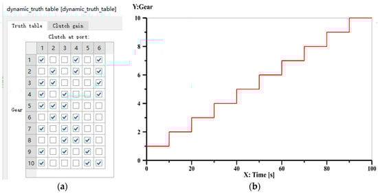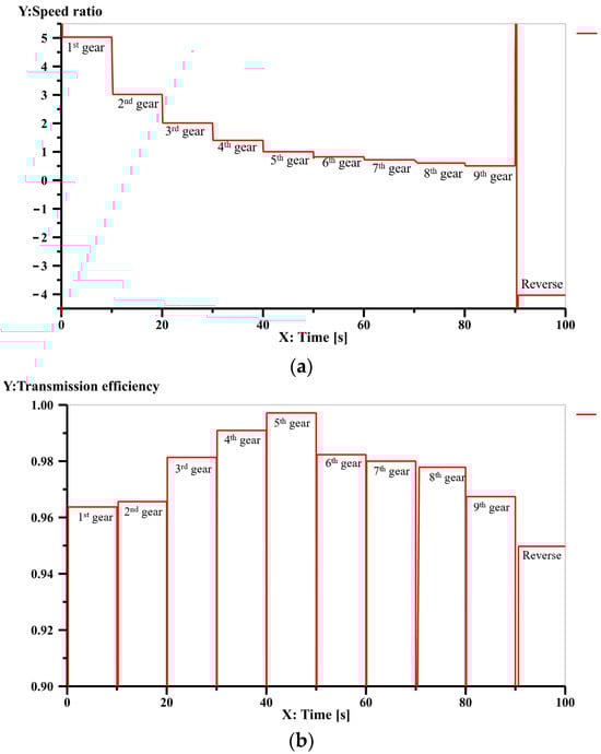 Simulation result of speed ratio (a) and transmission efficiency (b) for each gear of Figure 11a.
