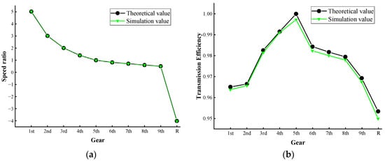 Simulation result of speed ratio (a) and transmission efficiency (b) for each gear of Figure 12a.