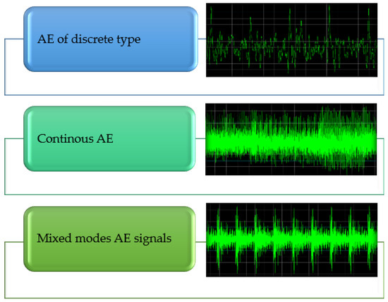 The phenomenon of acoustic emission (AE) has been known for centuries, but it was only in the 1950s that it was described and cataloged as a physical phenomenon. Historically, it was more about its typically acoustic form (e.g., audible crackling when a certain mechanical stress threshold is exceeded). In the mid-20th century, however, the acoustic emission name began to be used and defined. There is a certain inconvenience in the name itself, as it was translated from English as “acoustic emission”. For most people, including some scientists, it is associated with the audible band, i.e., between 20 Hz and 20 kHz. In its original meaning, this concept is much broader, mainly in the case of the generated elastic wave frequency band (from a fraction of a hertz to the order of megahertz). Modern AE measurements record elastic waves over a much wider bandwidth and are limited only by the attenuation of waves and the sensitivity of the sensors used in the measurements. A certain explanation for the acoustic emission name (not limited to the band of audible sounds) is the historical understanding of the phenomenon. In the past, the only “sensor” was the human ear. As an example, working miners were able to predict a collapse in the mine based on the sounds they heard. What they heard were the characteristic sounds of stamps breaking or the earth moving. What the miners recorded was within the limits of audible phenomena, but in fact, it was an overlap of various signals, which nowadays can be broken down into many components with higher and lower frequencies. Similarly, in ancient times, the quality of sulfur was assessed. Depending on the sounds emitted when pressing it, classification was made as to how “good” the mineral is. The phenomenon of acoustic emission itself is defined as the propagation of elastic waves in various media. It can also be stated, following the author of [31], that acoustic emission arises as a result of the release of energy stored inside an elastic medium. It is a dynamic change related to the local reconstruction of the structure of the tested material (or materials) and arises as a result of the release of energy-binding molecules by, for example, cracking, phase transformations and deformations. In most cases, we deal with several phenomena at the same time. In 2011, the non destructive testing standard [32] was adopted which defines acoustic emission as a physical phenomenon occurring in a material in which, as a result of a certain process, a decaying elastic wave is created [33]. This general definition takes into account all forms of excitations (also, e.g., medium flow or tribological processes taking place in friction nodes). We distinguish three basic types of acoustic emission: discrete type, continuous type and mixed type (Figure 3).