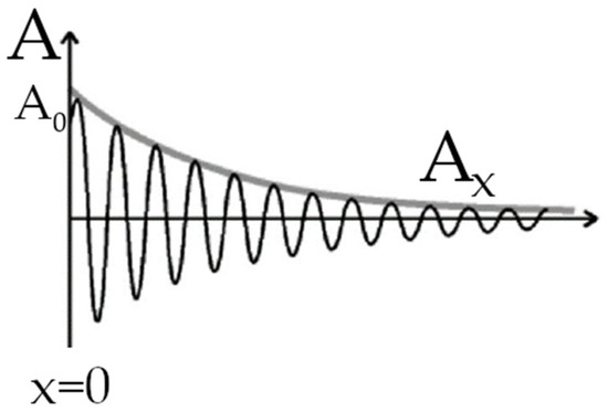 As it is shown in the Equation (12), the decrease in intensity with distance from the source is expressed with a minus sign. Graphically, the attenuation can be represented as a decaying wave (Figure 7).