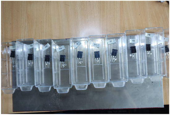 The transistor’s load consisted of a resistive wire wrapped in a ceramic framework with a suitably chosen resistance. The ambient temperature during transistor operation was at room temperature, ranging between 23 and 25 °C. Each measurement lasted from 60 to 120 s and was recorded in a separate file for further analysis. The table displays the average values of the current flowing in the conducting state through the collector–emitter junction. Various parameters were tested in the pre-test phase prior to the main investigation.