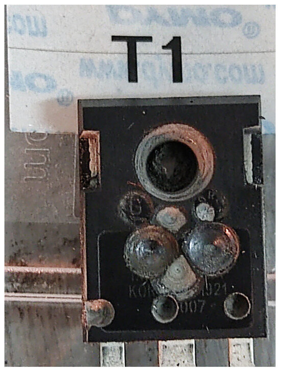 In the next test, the transistor denoted as T2 was also subjected to mechanical compression and its housing was significantly damaged (see Figure 18), but the transistor was still able to switch the current flow.
