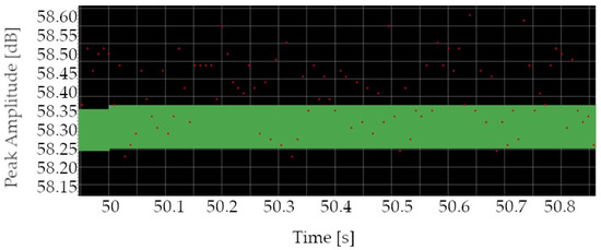 In Figure 15, which is a one-second excerpt of a recording, it can be observed that the events are spaced approximately one-hundredth of a second apart, corresponding to the switching frequency. Different positions of points of acoustic emission events on the amplitude axis are caused by a significant approximation and imperfections in the equipment which can be contributed mainly to the fact that the power supply was of pulse type and a relatively small current flow could cause the transistor not to have enough time to discharge internal capacitances.