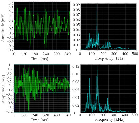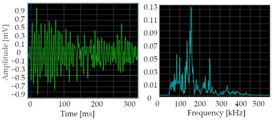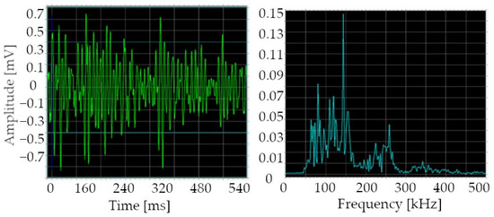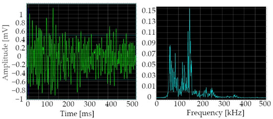 Each recording of acoustic events represented in Figure 15 by red dots can be presented in the time domain as well as in the frequency domain graphs, while in Figure 16 there is an example of AE signals obtained from brand, new IGBT. As it was observed, the events throughout the entire study period had very similar parameters.