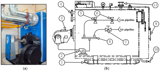 Boiler entity photos and gas system drawings: (a) boiler photograph; (b) gas system diagram: 1. Boiler foundation; 2. Air blower; 3. Fully premixed burner; 4. Vacuum coil; 5. Gas hand valve; 6. Gas pressure regulator; 7. Air hand valve; 8. Static mixer; 9. Exhaust gas outlet; 10. Waste draining pipe.