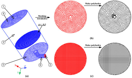 Full size of boiler fluid domain and mesh optimization: (a) computing domain grid; (b) comparison of front wall tetrahedral and polyhedral mesh; (c) comparison between tetrahedral mesh and polyhedral mesh when x = −0.3 m: 1. Fully premixed surface burner; 2. Boiler flue gas outlet; 3. Water wall tubes; 4. Front wall of the furnace; 5. Back wall of the furnace; 6. Chimney.