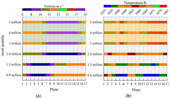 The calculation result is related to the grid generation, and the number of grids determines the calculation time, so the balance between the calculation time and the calculation accuracy should be considered comprehensively. In order to verify the mesh independence of the CFD calculation results, 17 planes were taken along the central axis of the burner at a spacing of 0.1 m (as shown in Figure 4), and the number of calculated grids was taken for a total of six working conditions ranging from 800,000 to 5 million. As shown in Figure 5, when the number of grids exceeds 3.2 million, the average speed and average temperature of each plane is compared and neither the average speed nor the average temperature of each plane changes. As shown in Figure 5a, when the number of grids exceeds 3 million, the average velocity of the 17 sections does not change with the number of grids, and the airflow velocity in the furnace decreases at the outlet of the furnace. As shown in Figure 5b, with the increase in the number of grids, the average temperature of the 17 sections fluctuates greatly. The maximum temperature level of the section is about 1060 K when the number of grids is 800,000; when the number of grids is between 800,000 and 2.4 million, the velocity field fluctuates slightly, while the temperature field fluctuates more. When the number of grids exceeds 3 million, the average speed and average temperature of each section in the furnace are stable at the same level. Therefore, 3,204,561 grid cells are used in this numerical calculation, which ensures the calculation accuracy and minimizes the calculation amount.