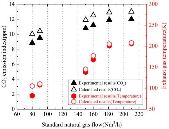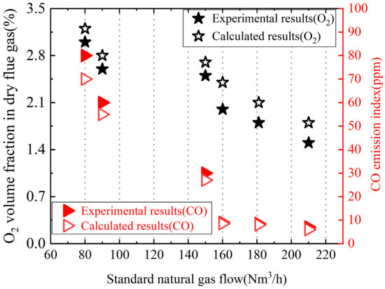 The denitrification effect is an important indicator of boiler emissions, and the emission of NOx is currently an important monitoring value for clean combustion. Under different gas flow conditions, the measured and calculated values of O2 and NOx emissions in flue gas are compared, as shown in Figure 8. In the figure, it can be seen that except for the minimum flow rate (i.e., when the gas flow rate is 80 Nm3/h), the NOx emissions show an increasing trend with the increase in flow rate. This is because thermal NOx dominates, accounting for 31.1% of the total NOx [52]. As the flow rate increases and the exhaust temperature increases (as shown in Figure 7), the generated thermal NOx shows an increasing trend. At the same time, due to the increase in flue gas volume, the total NOx emissions increase. The calculated NOx generation value is higher than the actual measurement value, which is caused by the high temperature in the calculated furnace. This is consistent with the previous conclusion, with a maximum calculation error of 15.4%. Under six operating conditions, the NOx emission value is lower than 30 mg/Nm3 and the emission standard meets the environmental protection requirements of Beijing-Tianjin-Hebei.
